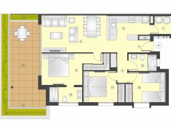 Die Wohnungen und Bungalows im Erdgeschoss verfügen über einen Garten, während die Wohnungen im Obergeschoss über eine Sonnenterrasse verfügen.