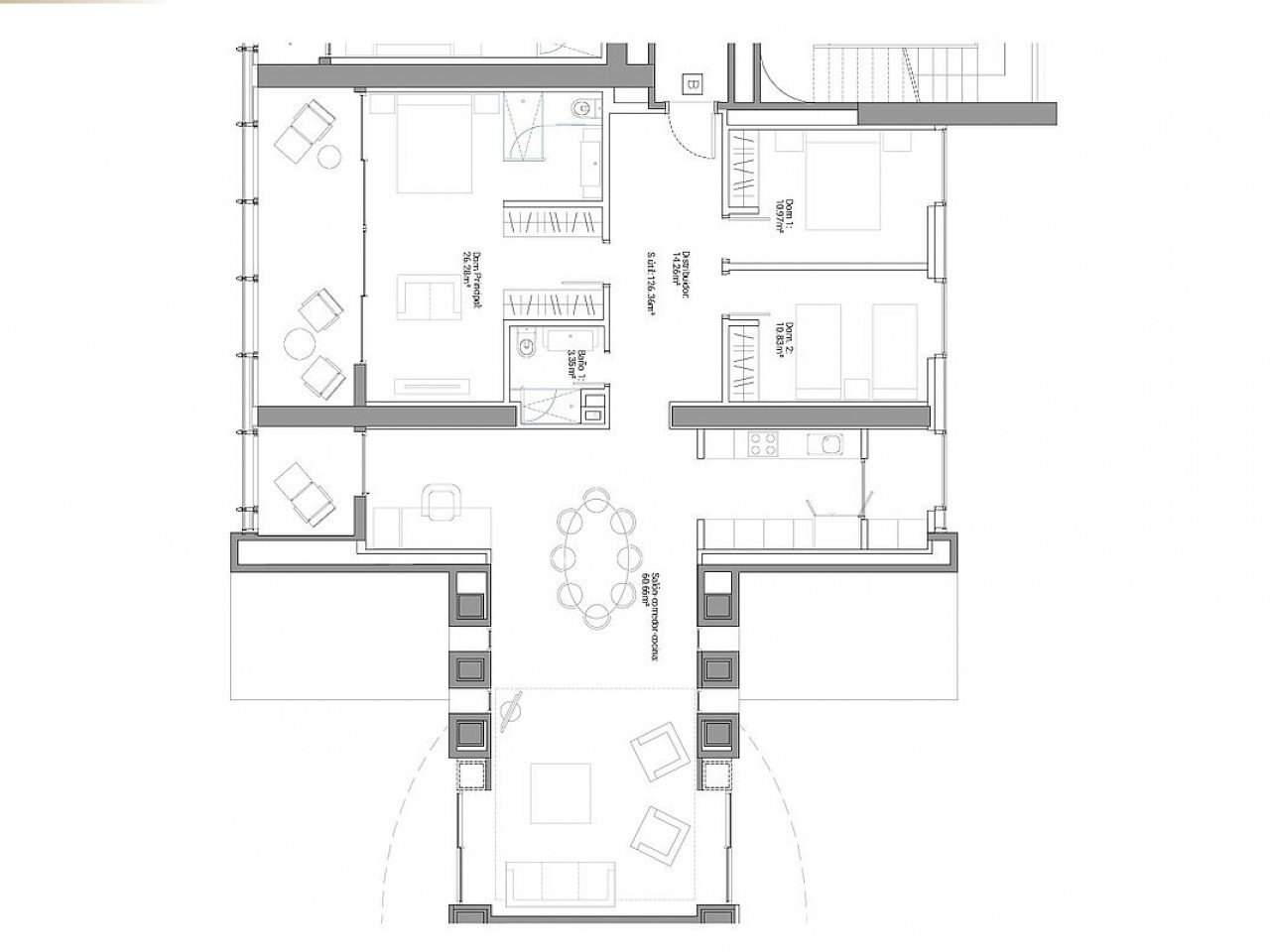 Alle Wohnungen haben eine große Terrasse, die von den Schlafzimmern und dem Wohnzimmer aus zugänglich ist.