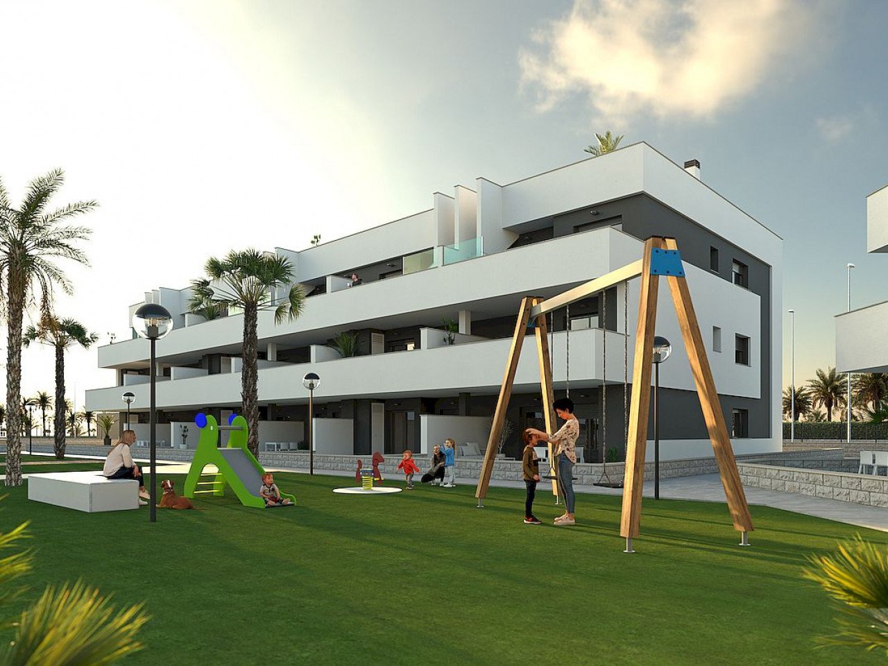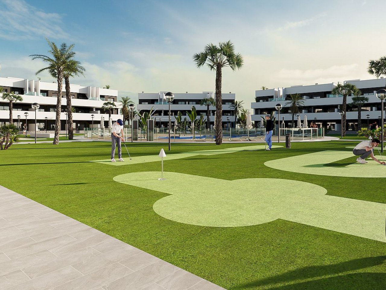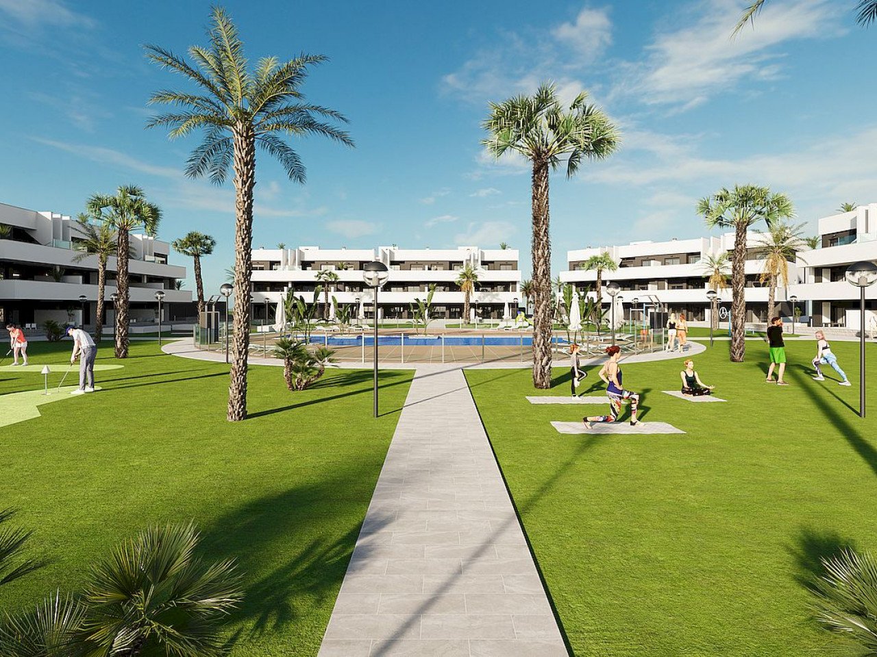 Dies ist ein Komplex aus Ferienwohnungen mit zwei oder drei Schlafzimmern und zwei Badezimmern, die sich um eine große Grünfläche mit einem Gemeinschaftspool gruppieren.