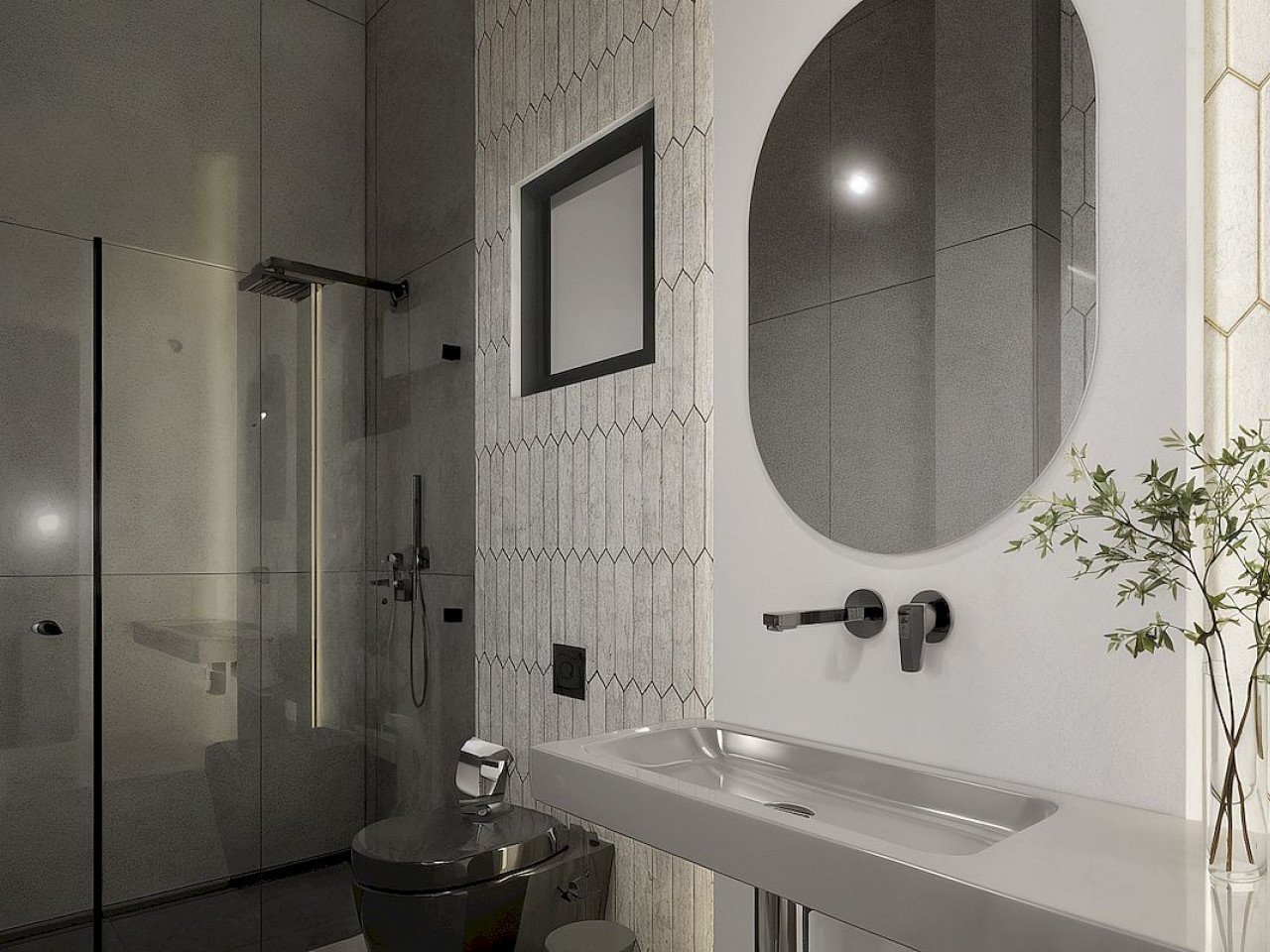 Im Obergeschoss befinden sich zwei geräumige Schlafzimmer, jedes mit eigenem Bad, eines davon en suite. Beide Schlafzimmer haben Zugang zu einer privaten offenen Terrasse von 17 m². Für diejenigen, die noch mehr Platz im Freien wünschen, gibt es gegen Aufpreis ein optionales Dachsolarium.