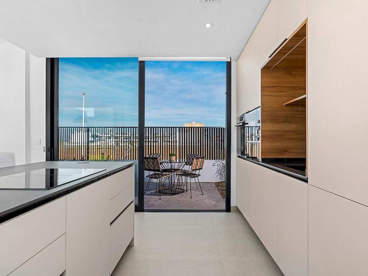 These contemporary detached villas, situated on plots of 400m2, comprise of three bedrooms, two bathrooms, dressing room, open plan living area with large windows and island kitchen that open onto the pool area, together with a fully-equipped kitchen of modern design.