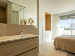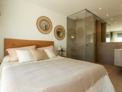 Auf dieser Etage gibt es auch ein Schlafzimmer und ein Badezimmer. Das geräumige Schlafzimmer hat Schiebetüren zum Pool. Im ersten Stock befinden sich zwei weitere Schlafzimmer und ein Badezimmer sowie eine geräumige Terrasse mit ganztägiger Sonne.