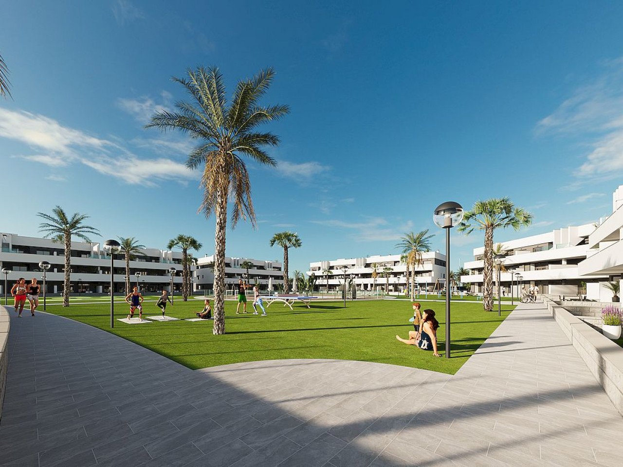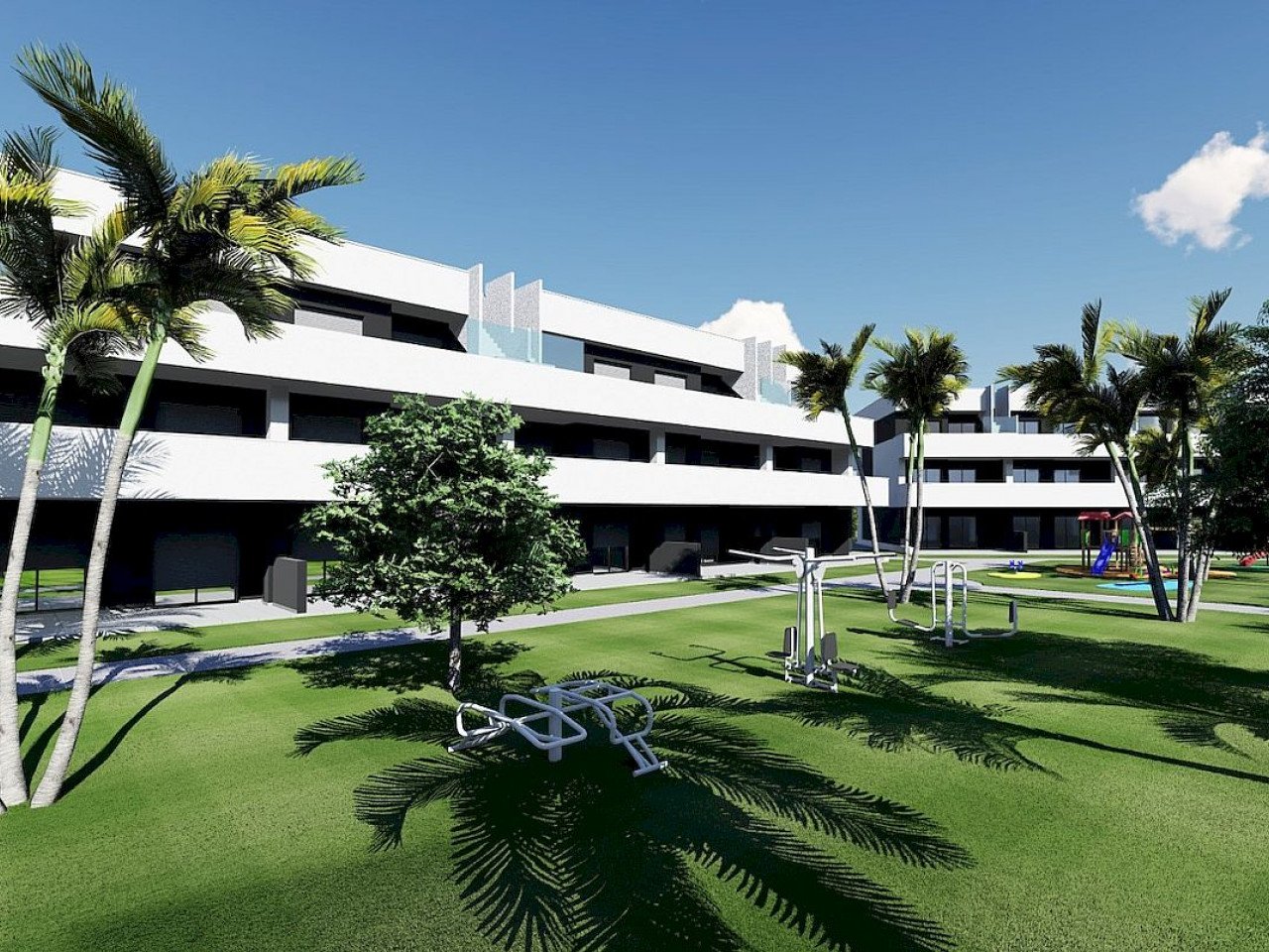 Dies ist ein Komplex aus Ferienwohnungen mit zwei oder drei Schlafzimmern und zwei Badezimmern, die sich um eine große Grünfläche mit einem Gemeinschaftspool gruppieren.