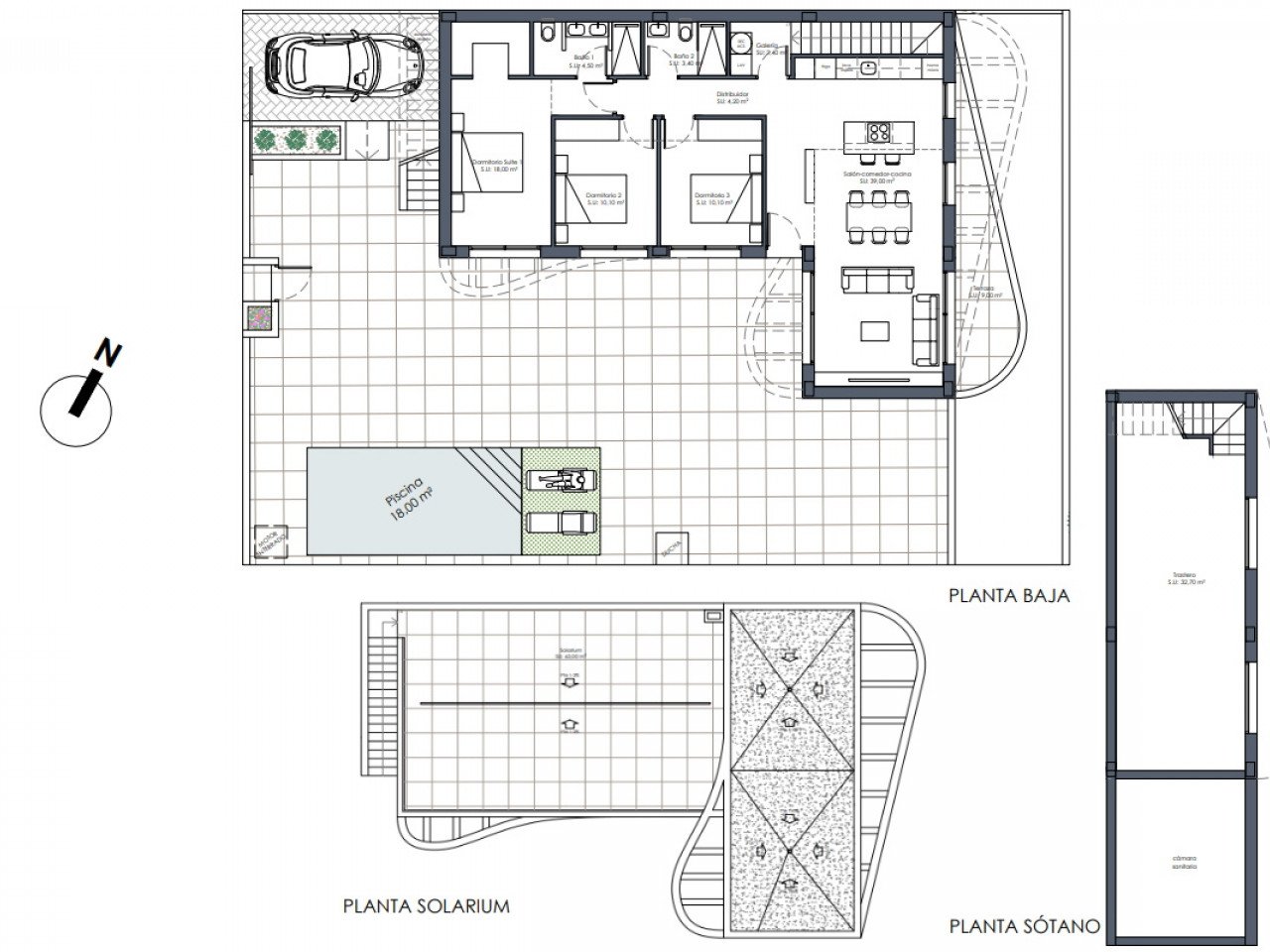 This project offers a wide selection of detached and semi detached villas in three different sizes. Homes are available on one or two levels and all feature three bedrooms and two bathrooms. The larger models also include a guest toilet. Villas on one level enjoy a spacious private rooftop solarium, while two level homes feature a large open terrace on the upper floor. Some units include a basement and others offer this option at an additional cost. All villas come with a private swimming pool and parking space within the plot.